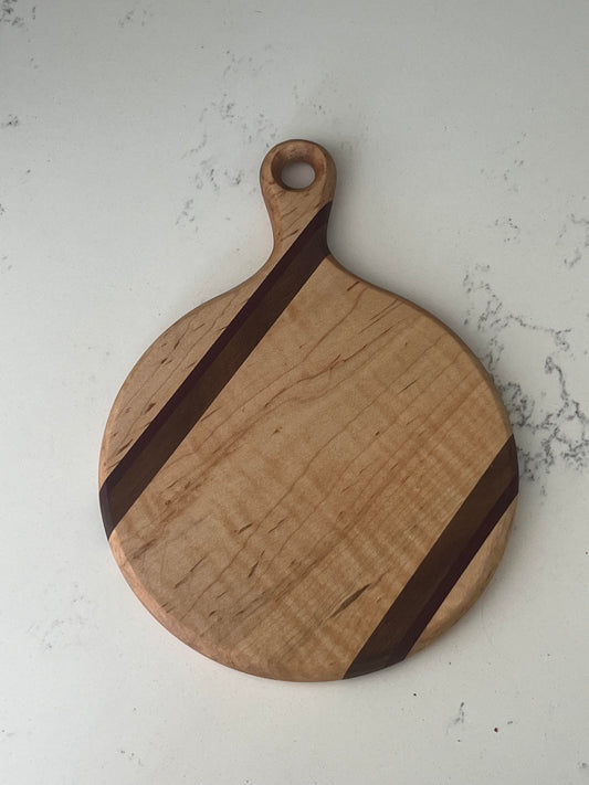 Round Paddle Cutting Board- Maple, Walnut, and Purple Heart- 11" x8"