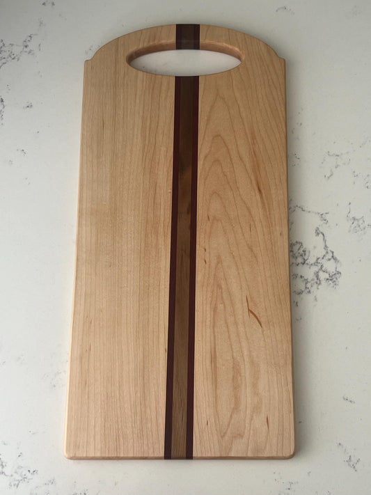 Handmade Cutting Board with Handle- 16.75" x 7.75"Maple, Purple Heart, Walnut, Curved Handle